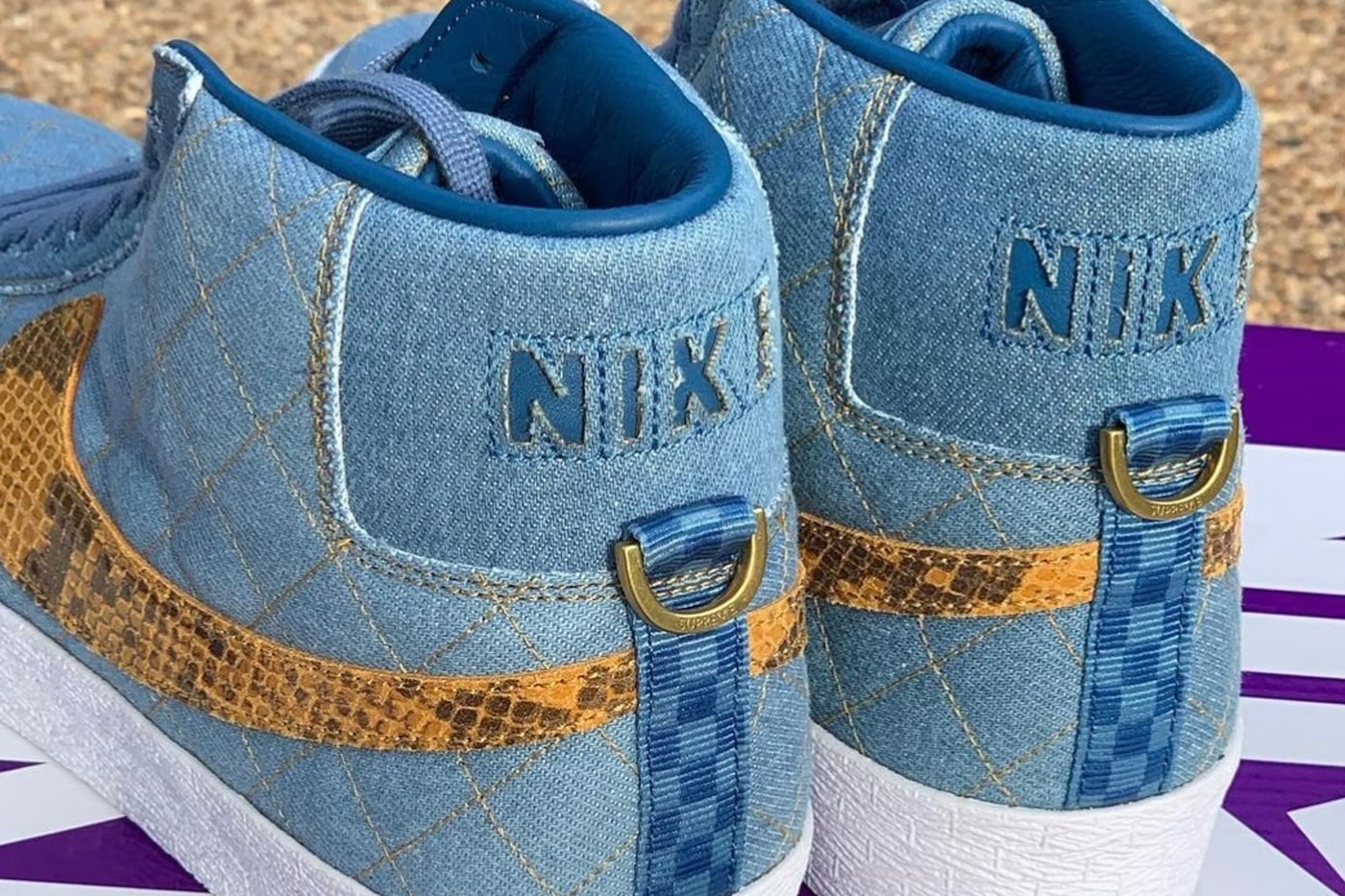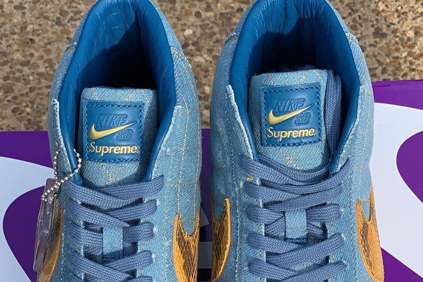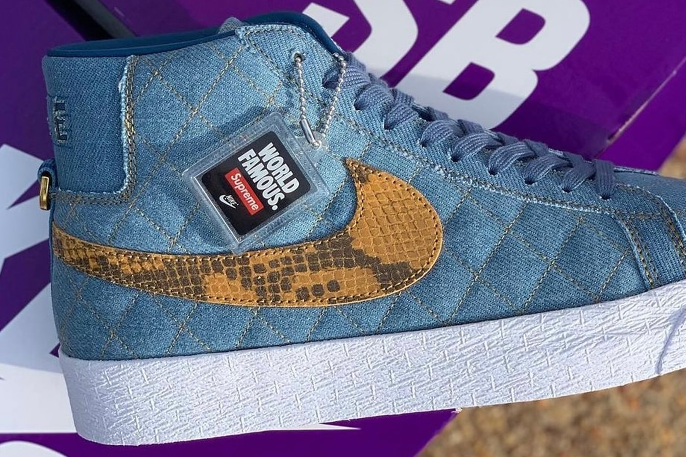 当初リークされた“Black/Golden”に続きお目見えしたのは、“Industrial Blue”と称された1足。アッパーには淡いブルーのキルティング生地が使用され、サイドには目を引くパイソン皮の型押しレザーのスウッシュを装飾。レザーのシュータンタグにはスウッシュと〈Supreme〉のロゴをゴールドで施し、ヒールにもゴールドカラーの金具があしらったラグジュアリーな仕様にも注目したい。さらに、両ブランドのネームと“WORLD FAMOUS.”の文字が並ぶタグが付属し、インソールも〈Supreme〉を象徴するレッドカラーにアレンジされるなど、コラボならではのディテールが詰め込まれたスペシャルなモデルとなっている。