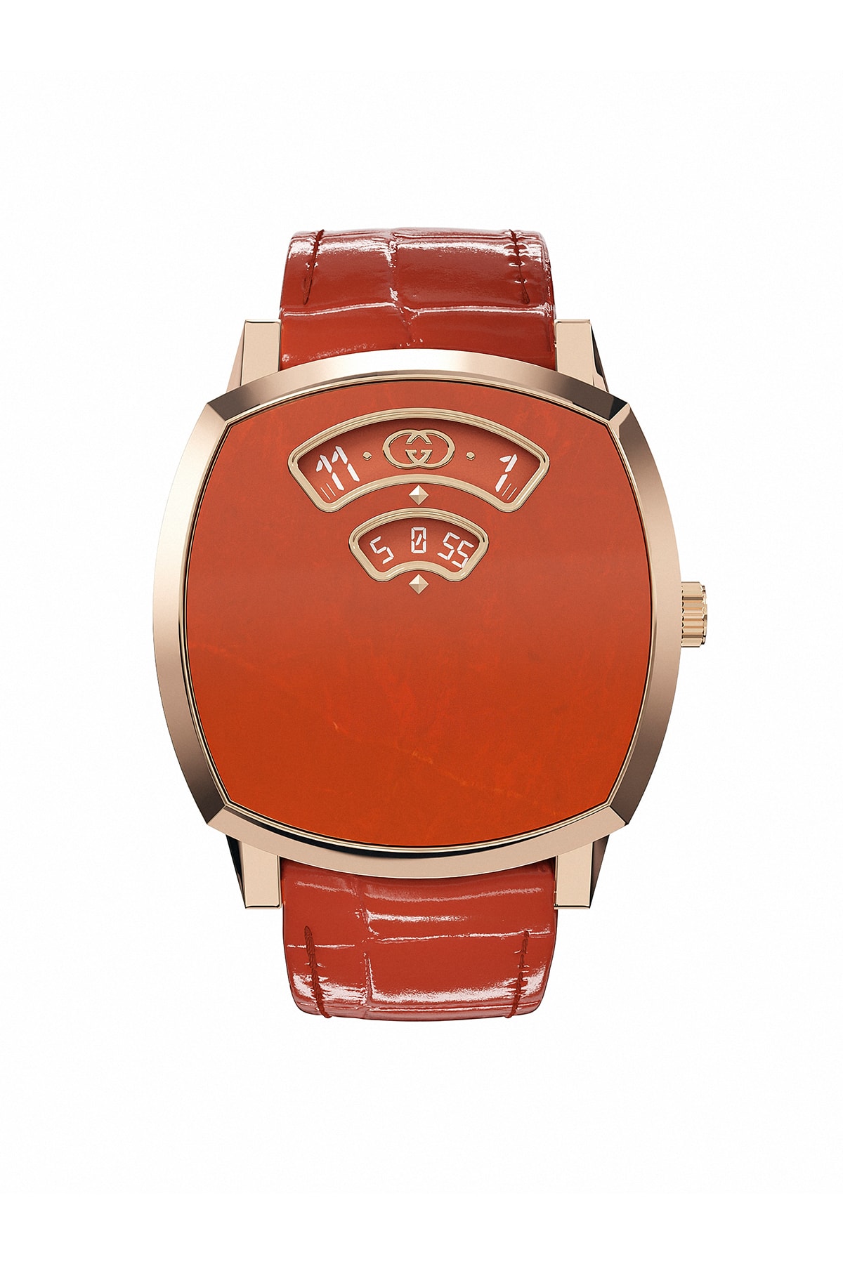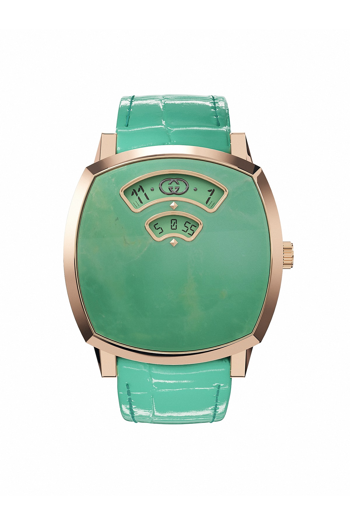 2023年の新作は、この人気のグリップにハードストーンダイアルと18Kピンクゴールドのケースを組み合わせ、アリゲーターストラップを備えたヴィンテージ感溢れる2本が登場(*上のフォトギャラリーの写真がそれ)。カラーはレンガ色のジャスパーダイアル+同色のストラップ、クリソプレーズのダイアル+ミントグリーンのストラップがラインアップ。レトロなデザインに〈Gucci〉らしい遊び心を加えた同モデルは、従来のストリートスタイルを“ワンランク上”に格上げしてくれることは間違いないだろう。