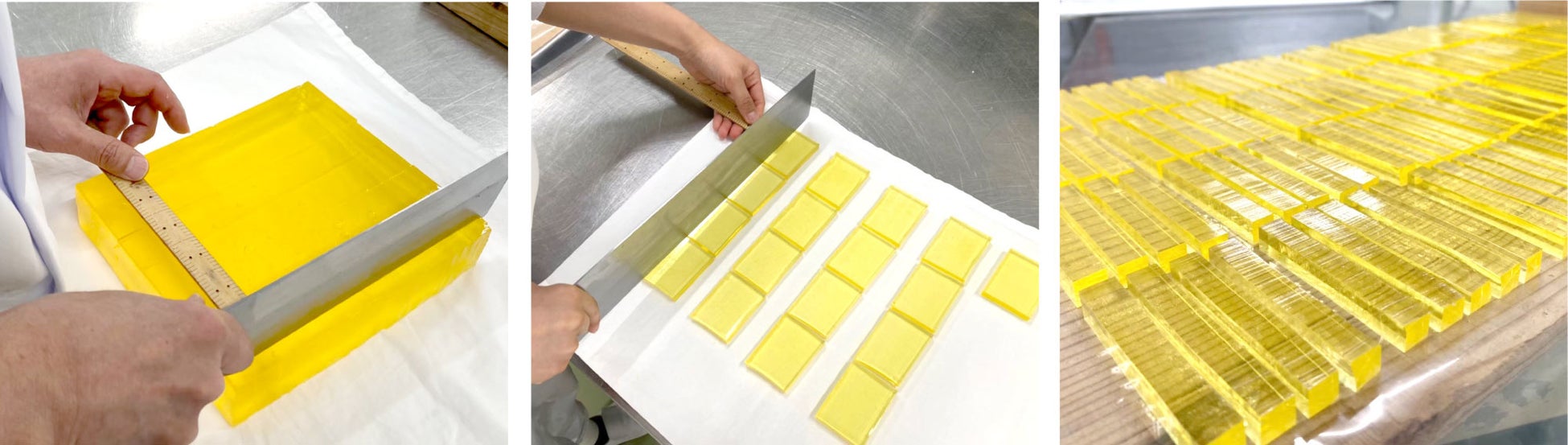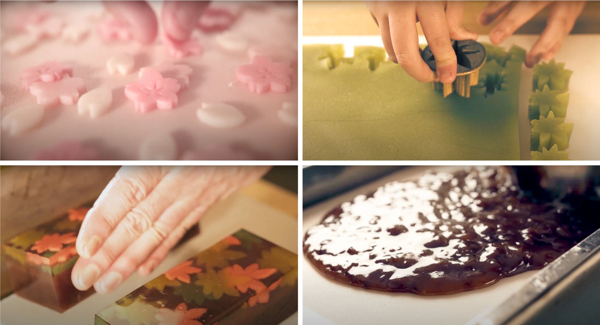 ひとつひとつを職人の手仕事にて、羊羹をくり抜いて丁寧に並べ、素材の風味を活かした小倉羹を炊き上げ、流し込み…季節を感じる、まるで工芸品のようなお菓子という意味をこめて「工藝菓」と名付けました。