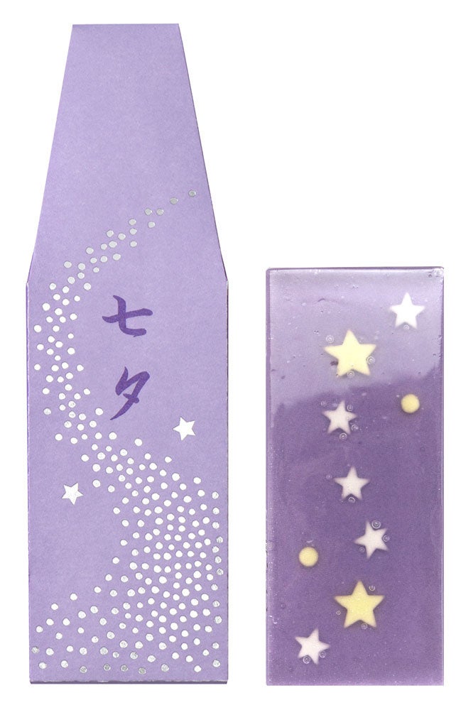 夏の夜に輝く星を透きとおる琥珀羹にとじこめ、風味豊かな小倉羹と合わせた二層羊羹。ひと棹ひと棹、職人の手仕事でおつくりした銘菓を、天の川の箔押しをあしらったパッケージに包みました。