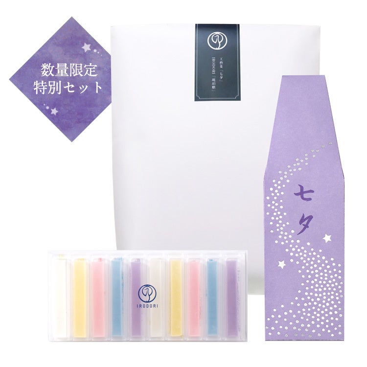 さらに今年は、IRODORI(イロドリ)ブランド店舗限定、SNS等でも注目の人気商品「琥珀糖」とあわせた特別セットを数量限定にてご用意いたしました。伝統×革新のきらめく京銘菓で、夏の星空に想いをはせるひとときをお楽しみください。