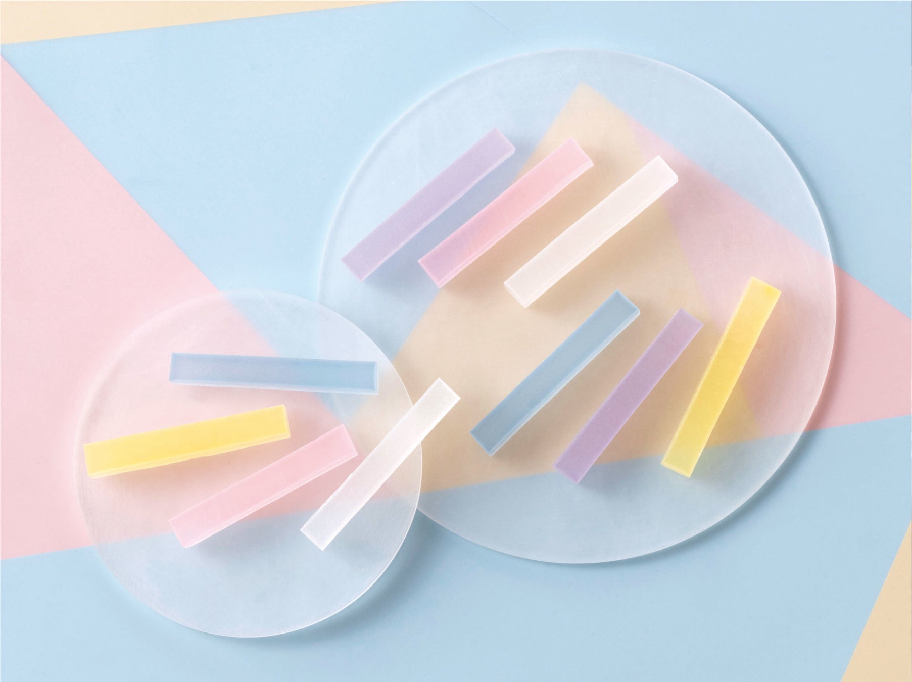 硬めのゼリーのような状態から、型でくり抜いたり、ちぎったりして形をつくります。「IRODORI 琥珀糖」はこのお干菓子を「色とりどり」のパステルに見立てて、スマートな長方形に。カラフルな5色にはそれぞれ、ラベンダー、カモミールなど、華やかな5種のフレーバーをこめ、親しみやすく見た目も楽しめるお菓子に仕上げました。